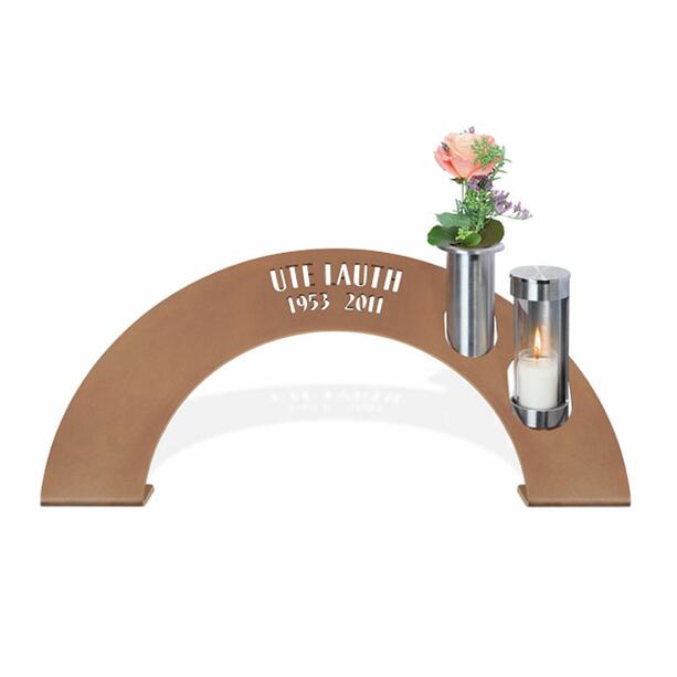 Bei der Gestaltung der Grabanlage steht Ihnen eine Vielzahl an Möglichkeiten zur Auswahl. Dieser Grabschmuck wird aus Bronze und Edelstahl angeboten. Für Weichgestein oder andere poröse und wasserziehende Gesteinsarten wird Grabdekoration aus Aluminium oder Edelstahl empfohlen. Die Gedenktafeln werden sorgfältig hergestellt und mit einem Schutzlack versehen. Schmutz sollte mehrmals im Jahr mit einem feuchten Tuch entfernt werden, um die Wirkung des Lacks solange wie möglich aufrechtzuerhalten. Reinungsmittel sind nicht erforderlich. Die Fertigung mit einer Cortenstahlpatina ist möglich. Im Gegensatz zu richtigem Cortenstahl liegt der Vorteil im Nicht-Verlaufen der Rostpatina bei Nässe.