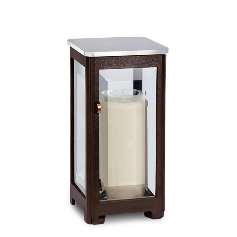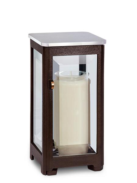 Diese eckige Grablaterne mit Edelstahldeckel wird aus hochwertigem Bronze Guss in traditioneller Handarbeit in einer süddeutschen Bronzegießerei hergestellt. Charakteristische Feinheiten und Details der Grablampen werden liebevoll von Künstlerhand ausgearbeitet. Der Korpus der handgefertigten Grableuchte wird durch eine spezielle Oberflächenbehandlung witterungsbeständig und wird auch nach vielen Jahren noch in seinem ursprünglichen Glanz erstrahlen. Um Diebstahl vorzubeugen empfehlen wir, die Grablampe mit Hilfe der mitgelieferten Schrauben und Gewindestifte fest am Untergrund zu verschrauben. Gerne fertigen wir Ihnen für Ihre wertvolle Grableuchte auch einen zu Ihrem Grabmal passenden Naturstein Sockel an. Dieser wird für die feste Installation des Grablichtes vorbereitet. In die Laterne können Grabkerzen bis zu einer Höhe von 14cm und einer Brenndauer von 7 Tagen leicht durch Sie eingestellt werden. Alternativ ist es möglich ein wartungsarmes batteriebetriebenes LED Licht in die Lampe einzustellen und diese elektronisch zu betreiben. Sollte einmal ein Glas kaputt gehen, können Sie jederzeit und günstig ein Ersatzglas in unserem Onlineshop nachbestellen. Die Fertigung mit einer Cortenstahlpatina ist möglich. Im Gegensatz zu richtigem Cortenstahl liegt der Vorteil im Nicht-Verlaufen der Rostpatina bei Nässe.
