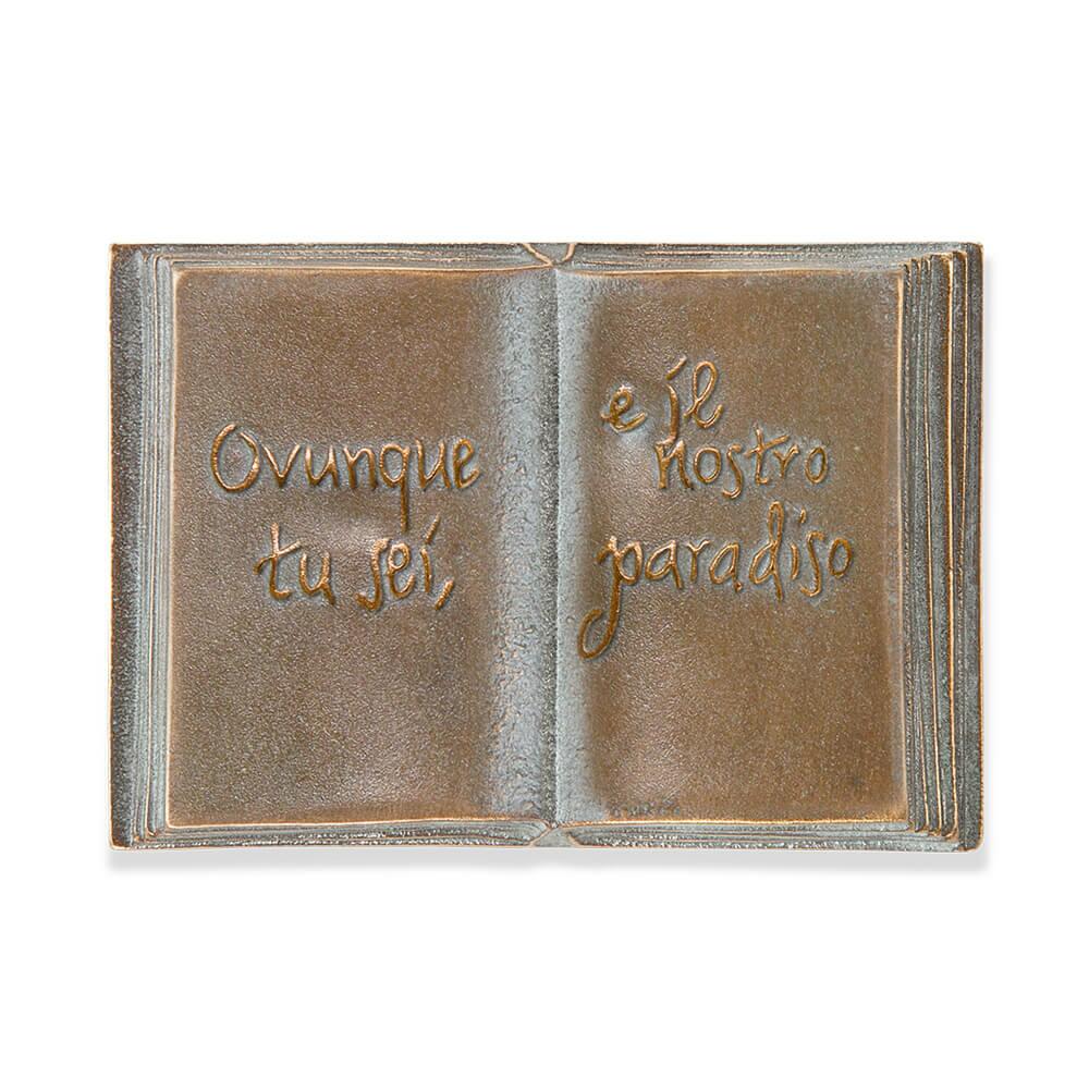 Der Grabengel wird inklusive Buch mit italienischem Schriftzug aus Bronze hergestellt. Es kann wzischen verschiedenen Größen sowie Farbvarianten gewählt werden. Beide Grabelemente haben Gewinde zur Fixierung auf einem Steinsockel.