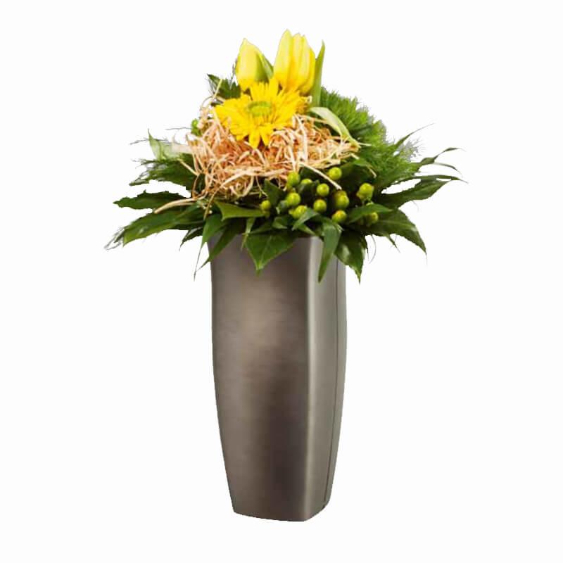 Unter den Werkstoffen, die für eine stilvolle Grabvase in Frage kommen, ist Bronze ein robuster und verschleißfester Vertreter. Dabei zeichnet sich der Werkstoff aber nicht nur durch seine hervorragenden technischen Eigenschaften, sondern auch wegen des warmen Farbtones aus. Gleichzeitig wird Bronze sowohl beim klassischen als auch modernen Kunsthandwerk eingesetzt und passt schematisch zu den allermeisten Grabstätten. Zusätzlich ist die Beständigkeit dieses Materials unvergleichlich, da es unbeschadet Frost, Hitze und Nässe übersteht. Ob als Stand- oder Versenkvase, unsere Blumenvasen sind der optimale Grabschmuck für Urnen-, Einzel- und Doppelgräber. Die Montageelemente zur Befestigung auf einem Steinsockel liegen standartmäßig bei Ihrer Bestellung bei.