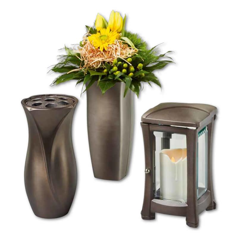 Farbenprächtige Blumen halten die Erinnerung an die verstorbene Person lebendig und lassen sich in der passenden Grabvase aus Bronze besonders stilvoll arrangieren. Die von uns angebotene Vielzahl an prachtvollen Grabvasen ermöglicht es, dass richtige Element für jedes Grabmal zu finden. Dabei kommt bei unseren Qualitätsansprüchen nur eine Fertigung von Meisterhand in unserer qualifizierten Werkstatt in Frage. Die von uns angebotenen Grabvasen sind nicht nur schön anzusehen, sondern auch funktionell. Denn der von uns mitgelieferte praktische Einsatz aus Kunststoff ermöglicht eine mühelose Reinigung und ein schnelles Wechseln des Wassers.