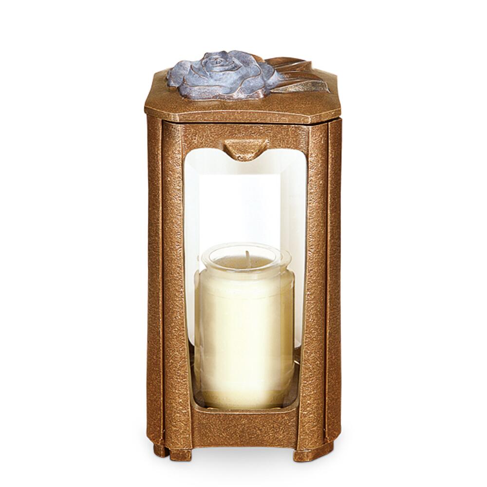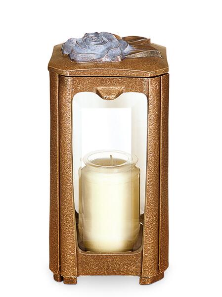 Bei dieser großen Grableuchte sticht einem sofort die filigran ausgearbeitete Rosenblüte ins Auge. Unsere Grablaternen werden in einer süddeutschen Bronzegießerei in traditioneller Handarbeit aus hochwertigem Bronze Guss gefertigt und von Künstlerhand liebevoll bis ins kleinste Detail ausgearbeitet. Durch die spezielle Oberflächenbehandlung des Laternen Korpus, wird dieser witterungsbeständig und erstrahlt auch nach vielen Jahren noch in seinem ursprünglichen Glanz. Das Grablicht kann mit Hilfe der mitgelieferten Schrauben und Gewindestifte fest und diebstahlsicher mit dem Untergrund verschraubt werden. Gerne fertigen wir Ihnen auch einen individuellen, zu Ihrem Grabmal passenden, Naturstein Sockel für Ihre neue Grablaterne an. In die Lampe können Öllichter bis zu einer Höhe von 14cm und einer Brenndauer von 7 Tagen eingesetzt werden. Alternativ haben Sie die Möglichkeit die Laterne mit Hilfe von LED Lichtern elektrisch zu betreiben. Sollte einmal ein Glas kaputt gehen, können Sie jederzeit günstig in unserem Onlineshop ein Ersatzglas bestellen. Passend zu dieser Grablampe finden Sie in unserem Shop weiterhin Grabvasen und Weihwasserkessel. Die Fertigung mit einer Cortenstahlpatina ist möglich. Im Gegensatz zu richtigem Cortenstahl liegt der Vorteil im Nicht-Verlaufen der Rostpatina bei Nässe.