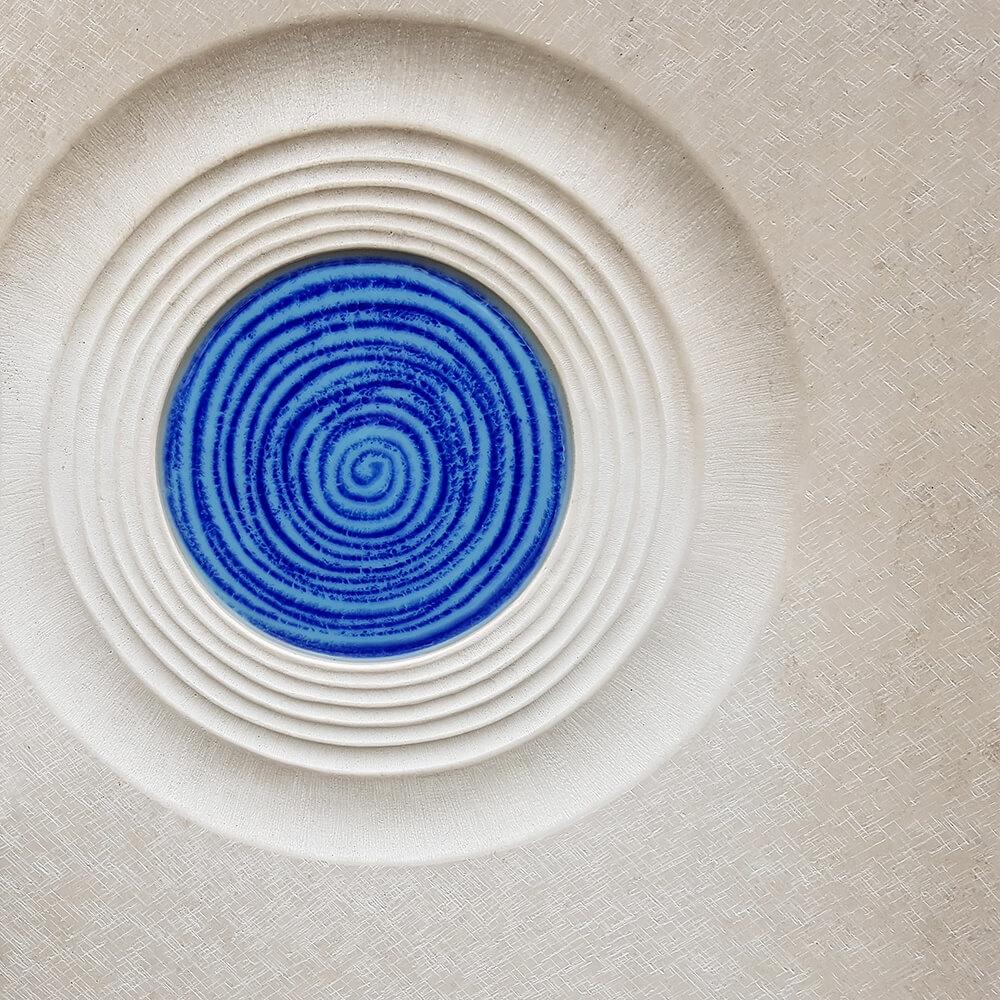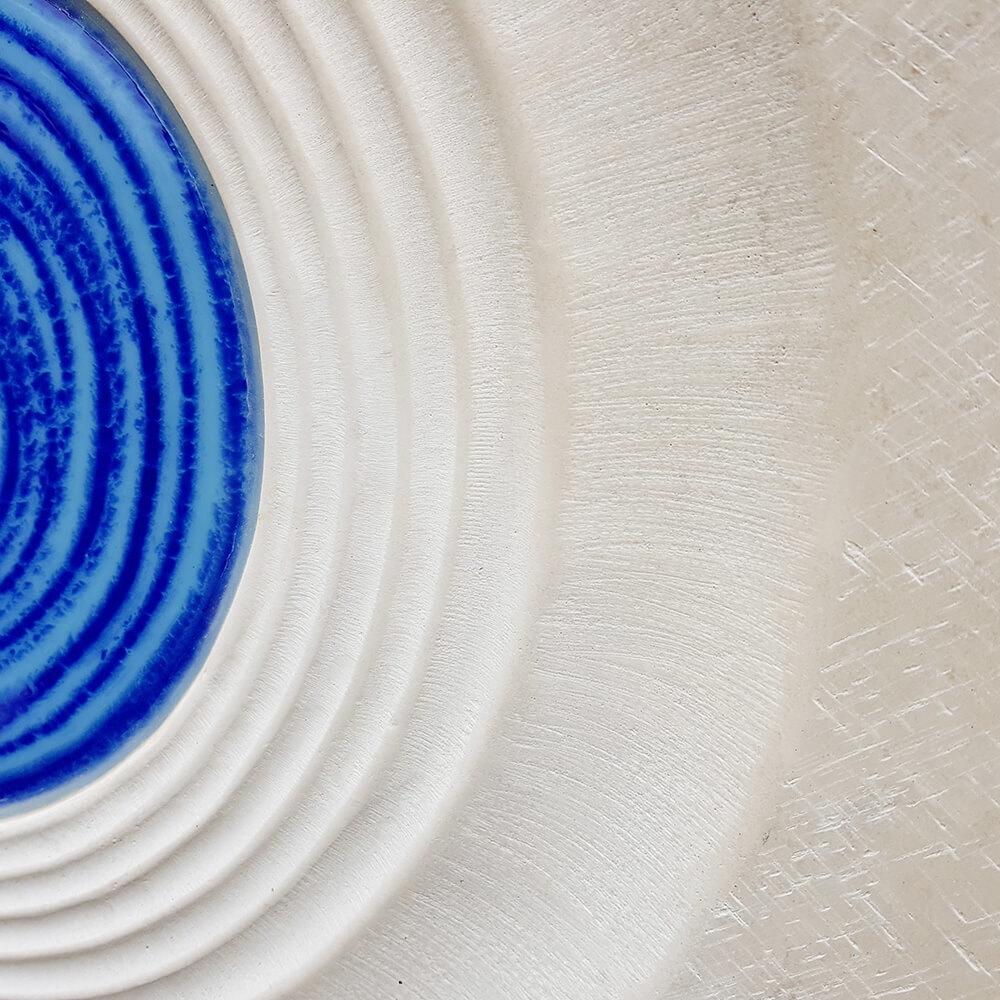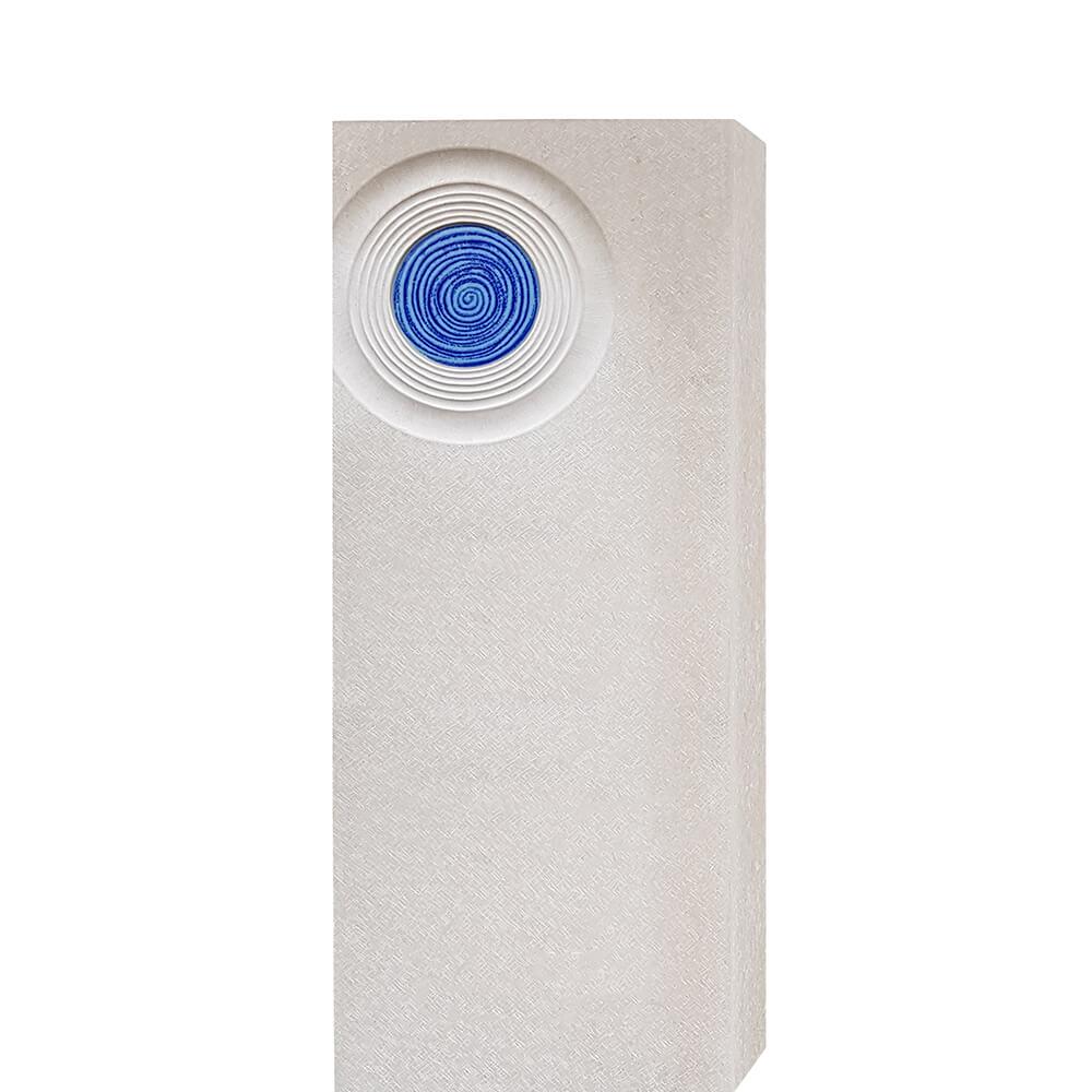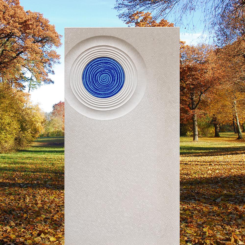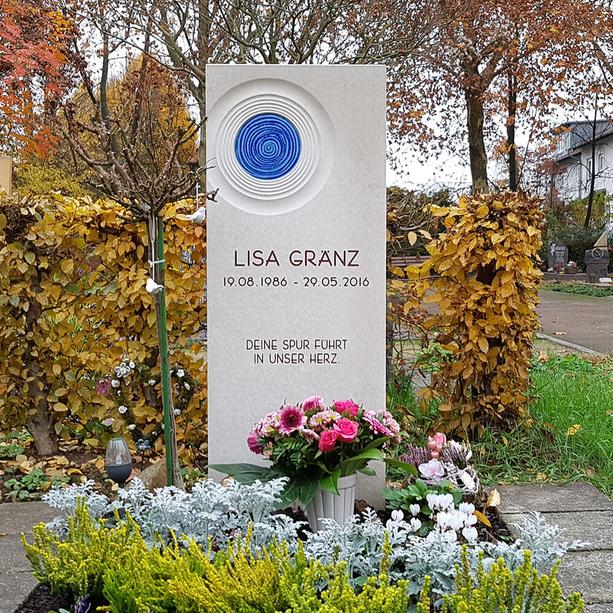 Heller Kalkstein in Kombination mit blau leuchtendem Glasguss verleihen dieser modernen Grabmalkomposition für ein Kindergrab einen besonderen Charme. Das Symbol des Lebenskreises steht für die Jahre des Lebens von der Geburt bis zum Tod des Verstorbenen. Der Kontrast zwischen hellem Kalkstein und leuchtendem Glasguss stärkt den Symbolgehalt dieser bildhauerisch umgesetzten Interpretation des Lebens von der Geburt bis zum Tode.