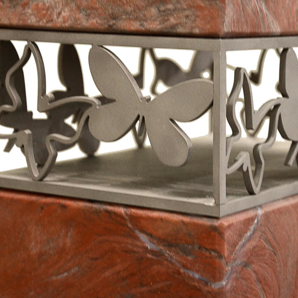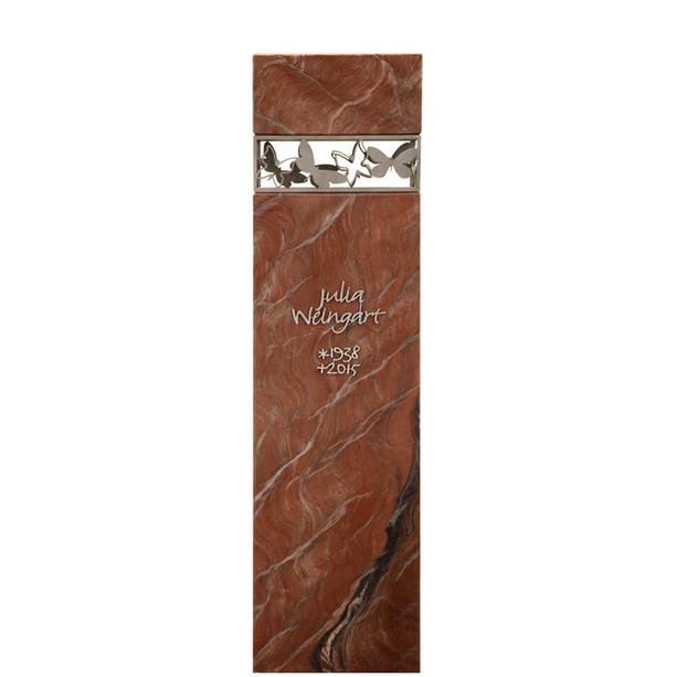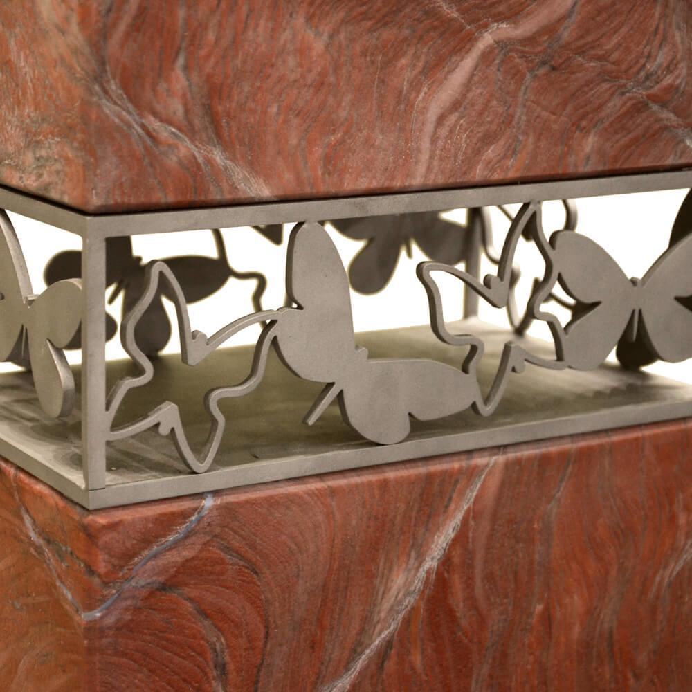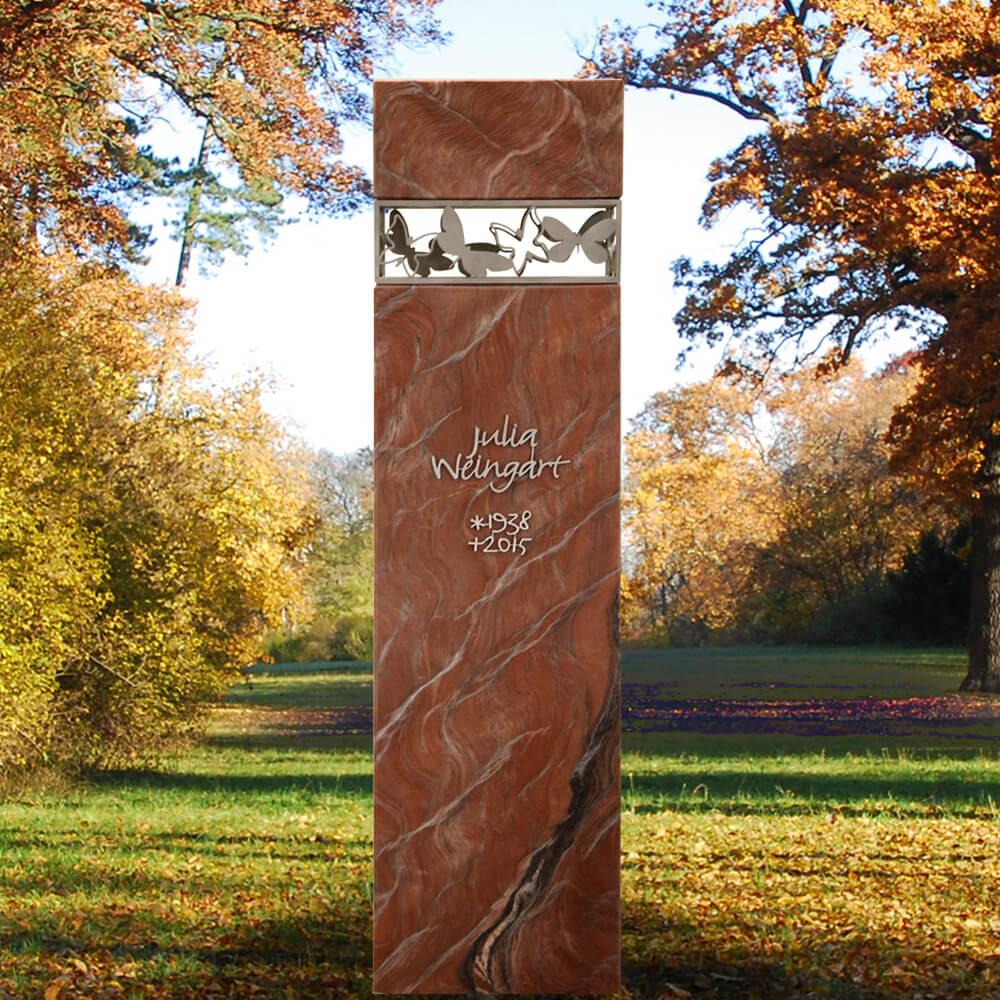 Moderne, zeitlose Grabstein Komposition aus edlem rötlichem Naturstein und seidenmatt gebürstetem Edelstahl. Kopfseitig mündet der Grabstein in ein rechteckiges Ornament mit Schmetterlingen, das als Rahmen die vertikale Form des Kindergrabsteins unterbricht. Das Edelstahlband wird fix mit den beiden Natursteinteilen verbunden. Im Kontext von Licht und Schatten entsteht ein wundervolles Denkmal als würdiger Lebensabschluss für einen geliebten Menschen.