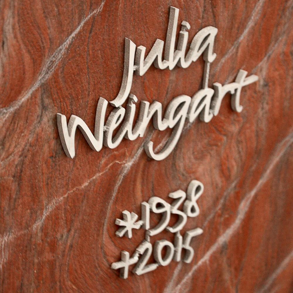 - Stilistische und inhaltliche Planung der Grabinschrift in einer Schriftart Ihrer Wahl. Wir erstellen Vorschläge zur Gestaltung des Schriftbilds auf Basis Ihrer Daten.