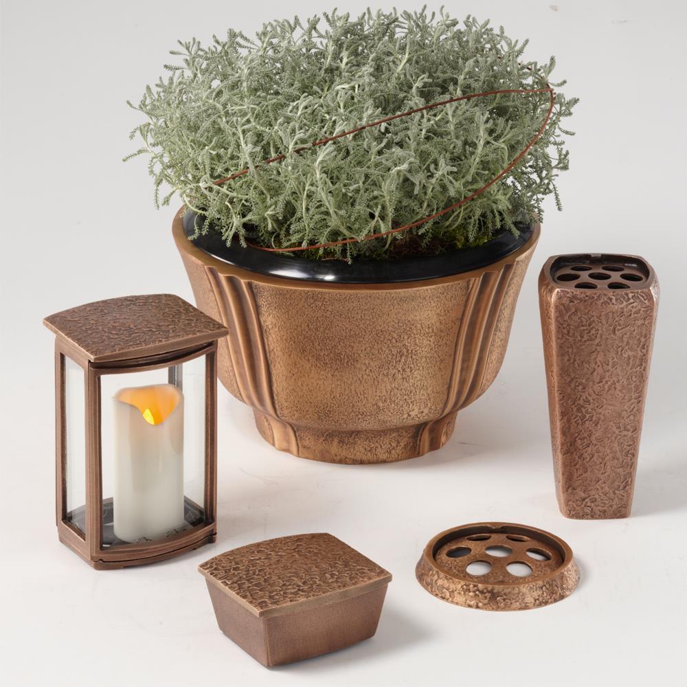 Trotz der sehr guten Verarbeitungsqualität und des hochwertigen Materials bleiben kleinere Verschmutzungen an der Oberfläche des Bronze Weihkessels nicht aus. Diese sollten von Zeit zu Zeit mit einem passenden Pflegezubehör entfernt werden. In unserem Online Shop bieten wir zur Reinigung und Pflege ein spezielles Bronze Pflegeset zum Kauf an. Weiterhin finden Sie in unserem Online Shop die zu diesem Weihwasserbecken zugehörige Grablaterne und Grabvase sowie die passende Grabschale zur stilvollen Grabgestaltung.