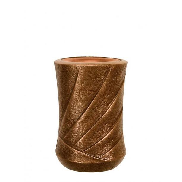 Diese kleine Wand Grabvase wird aus hochwertigem Bronze Guss in einer süddeutschen Bronzegießerei in traditioneller Handarbeit hergestellt. Alle charakteristischen Feinheiten werden von liebevoller Künstlerhand bis ins kleinste Detail gestaltet und ausgearbeitet. Eine einzigartige Oberflächenbehandlung lässt die Vase auch nach vielen Jahren noch in ihrem ursprünglichen Glanz erstrahlen. Sollte dennoch nach einigen Jahren eine Reinigung notwendig sein, erhalten Sie ein spezielles Pflegemittel für Bronze Grabschmuck in unserem Online Shop. Die Wandvase wird mit Hilfe der mitgelieferten Schrauben und Gewindestifte fest mit dem Grabstein verbunden. Ein herausnehmbarer Kunststoffeinsatz ermöglicht ein leichtes Reinigen und Austauschen der Blumen. Sollte dieser einmal verloren gehen, finden Sie diesen auch einzeln als Zubehör in unserem großen Sortiment. Die Fertigung mit einer Cortenstahlpatina ist möglich. Im Gegensatz zu richtigem Cortenstahl liegt der Vorteil im Nicht-Verlaufen der Rostpatina bei Nässe.