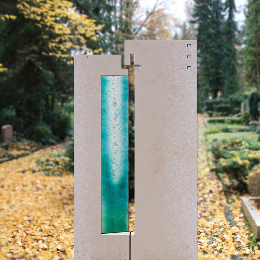Diese schöne Glasstele für Grabmale mit einem sanften Farbverlauf in Blau- un Grüntönen und einem leuchtenden Lichtkegel ist ein reizvolles Element stilvoller Grabsteingestaltung. Nach dem Brennen im Hochtemperaturofen entfalten die brillanten Farbtöne ein Maximum an Leuchtkraft bei gleichzeitiger Transparenz und Lichtdurchlässigkeit. Somit erlangt der Glasschmuck bei entsprechender Belichtung durch die Sonne eine besonders eindrucksvolle Strahlkraft. Der Glaseinsatz ist absolut witterungsfest und beständig. Dieses exklusive Schmelzglas können Sie mit einem unserer stilvollen Grabsteine kombinieren, wodurch dieser zu einem einzigartigen Ausdruck an Wertschätzung wird, welcher die Individualität des Verstorbenen widerspiegelt. Jedes unserer exklusiven Glasdekore ist individualisierbar und kann in Farbe, Größe und Motiv an Ihre ganz persönlichen Vorstellungen angepasst werden.