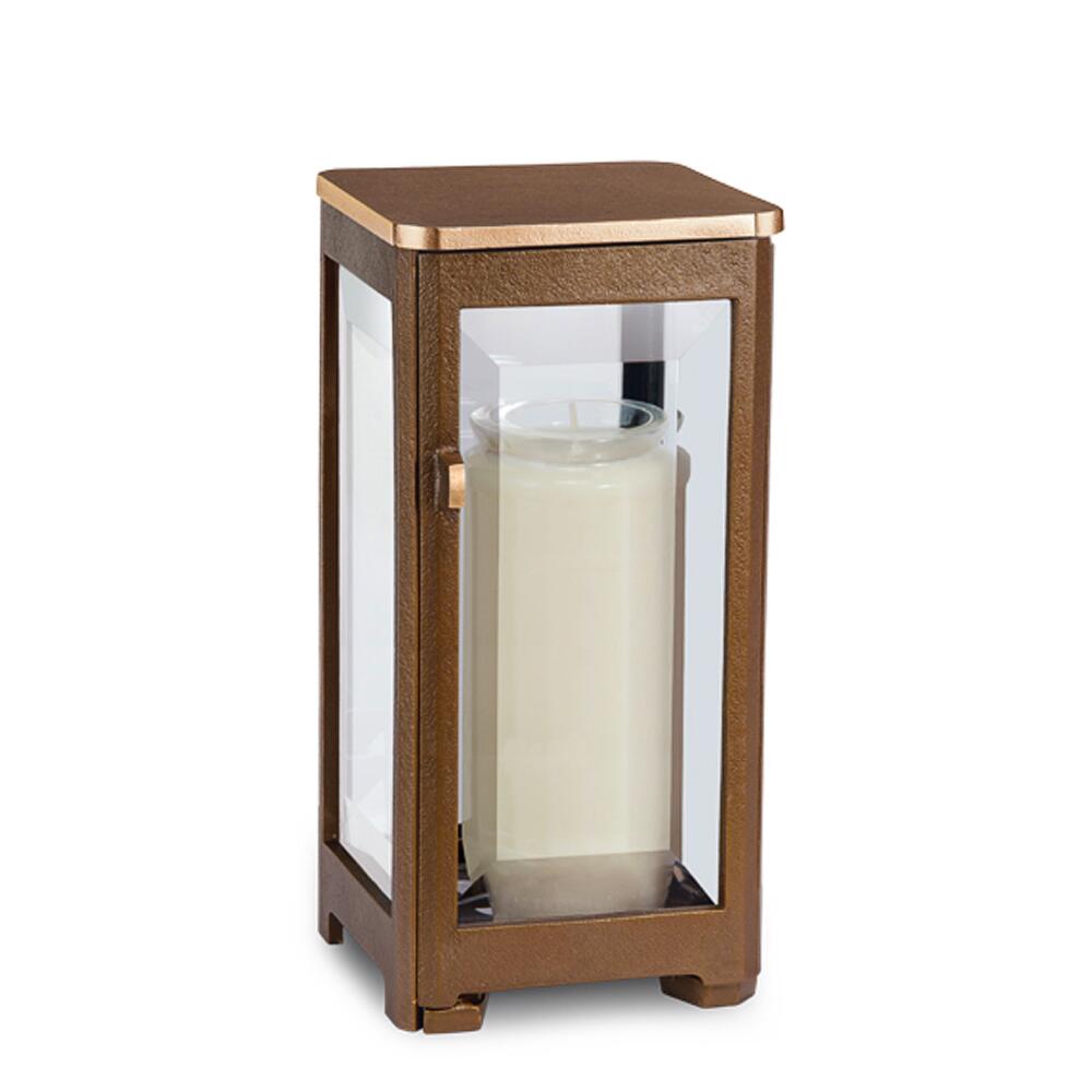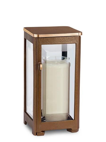 Dieses moderne Grablicht aus hochwertiger Bronze wird in einer süddeutschen Bronzegießerei in traditioneller Handarbeit hergestellt. Alle charakteristischen Feinheiten werden in liebevoller Detailarbeit von Künstlerhand ausgearbeitet. Der Korpus der Grablaterne wird durch eine spezielle Oberflächenbehandlung witterungsbeständig und erhält so auch nach Jahren noch seinen ursprünglichen Glanz. In Die Grableuchte können leicht Grabkerzen bis zu einer Höhe von 14cm und einer Brenndauer von 7 Tagen eingesetzt werden. Aber auch die Nutzung von batteriebetriebenen, wartungsarmen LED Lichtern ist möglich. Um Diebstahl zu vermeiden, sollte die Grablaterne mit Hilfe der im Lieferumfang enthaltenen Schrauben und Gewindestifte fest mit dem Untergrund verschraubt werden. Auf Kundenwunsch fertigen wir auch Naturstein Sockel passend zu Ihrer Grabanlage und bereiten diesen zur festen Montage Ihres neuen Grablichtes vor. Ein Ersatzglas für Ihre wertvolle Grablaterne erhalten Sie jederzeit günstig über unseren Online Shop. In unserem Sortiment finden Sie außerdem eine passende Weihwasserschale, eine Grabvase und Grablampen in verschiedenen Größen. Die Fertigung mit einer Cortenstahlpatina ist möglich. Im Gegensatz zu richtigem Cortenstahl liegt der Vorteil im Nicht-Verlaufen der Rostpatina bei Nässe.