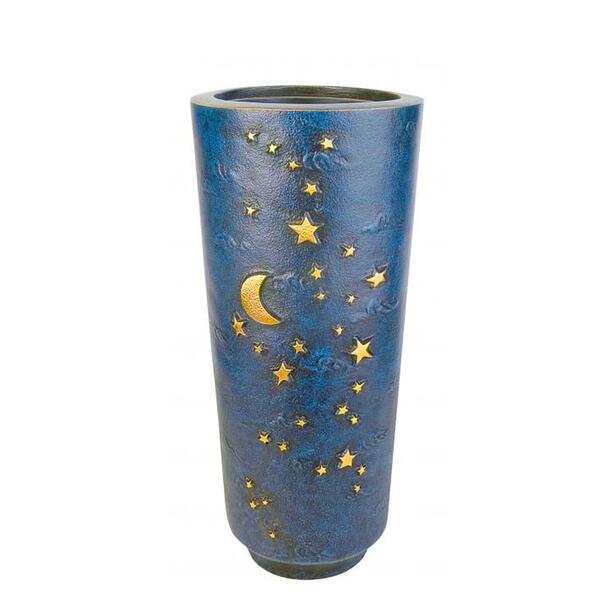 Alle charakteristischen Feinheiten wie die Sterne werden in liebevoller Handarbeit von Künstlerhand gestaltet und ausgearbeitet. In Kombination mit frischen Blumen hält diese edle Bronzearbeit die Erinnerung an einen geliebten Menschen in Würde lebendig. Eine einzigartige Oberflächen Imprägnierung sorgt für einen lang anhaltenden Glanz der Vase und ist unempfindlich gegenüber Verwitterung. Sollten Sie die Blumenvase trotzdem nach einigen Jahren einmal reinigen wollen, empfehlen wir ein spezielles Pflegeset für Bronze Grabschmuck aus unserem Sortiment. Die Fertigung mit einer Cortenstahlpatina ist möglich. Im Gegensatz zu richtigem Cortenstahl liegt der Vorteil im Nicht-Verlaufen der Rostpatina bei Nässe.