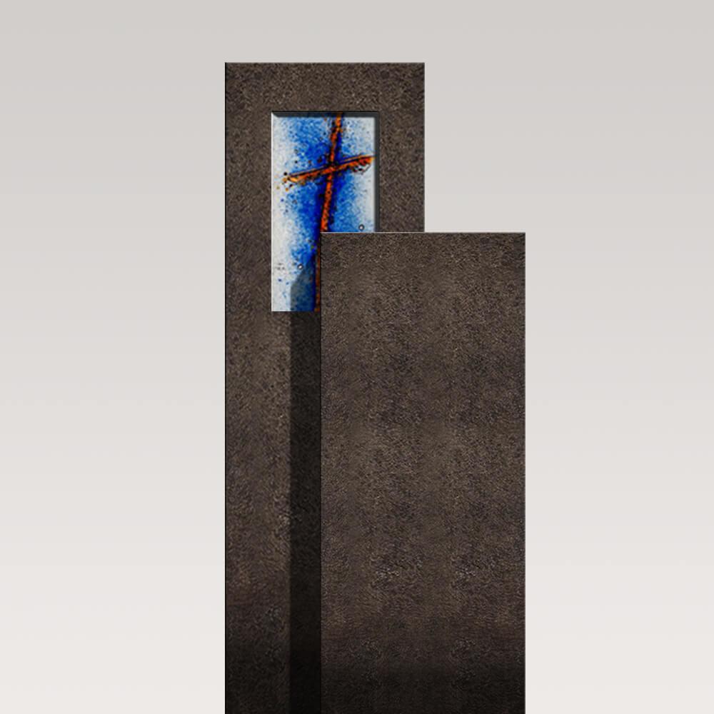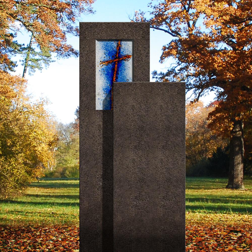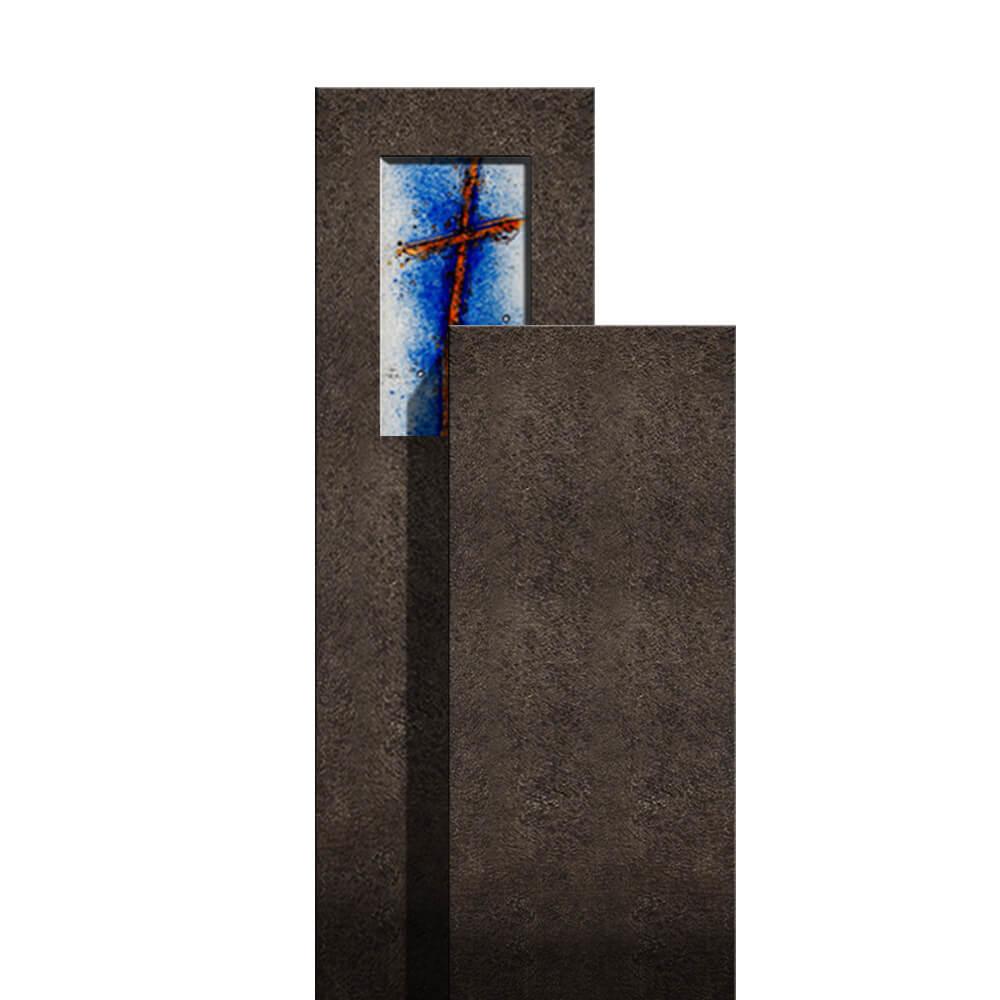 Die Form dieses zweiteiligen Grabsteins für einen Kindergrab entstammt dem Sakralbau.Die miteinander verzahnten Grabmalteile aus dunklem Granit lenken den Blick auf ein Glasgussornament mit christlichem Kreuz Motiv. Wahlweise sind für den Glasguss weitere Motive wählbar und mit dem Grabstein kombinierbar. Hinter das Glaselement kann ein Grablicht zur Beleuchtung gestellt werden.