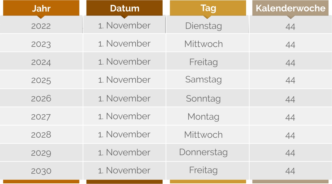 Allerheiligen Feiertage 2022 – 2030 im Überblick. © Serafinum.de