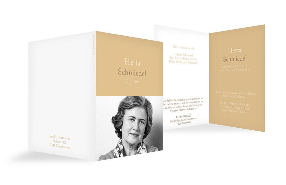 Im Fokus der Trauerkarte steht immer der Name der verstorbenen Person, der von dem Geburts- und Sterbedatum gefolgt wird. Meist werden diese Angaben auf die Vorderseite der Karte und über bzw. unter eine Fotografie gesetzt. Innerhalb der Karte können Sie einen Trauerspruch, Zitate von großen Denkern oder eine Würdigung setzen, mit denen die eigene Trauer in Worte gefasst werden kann.